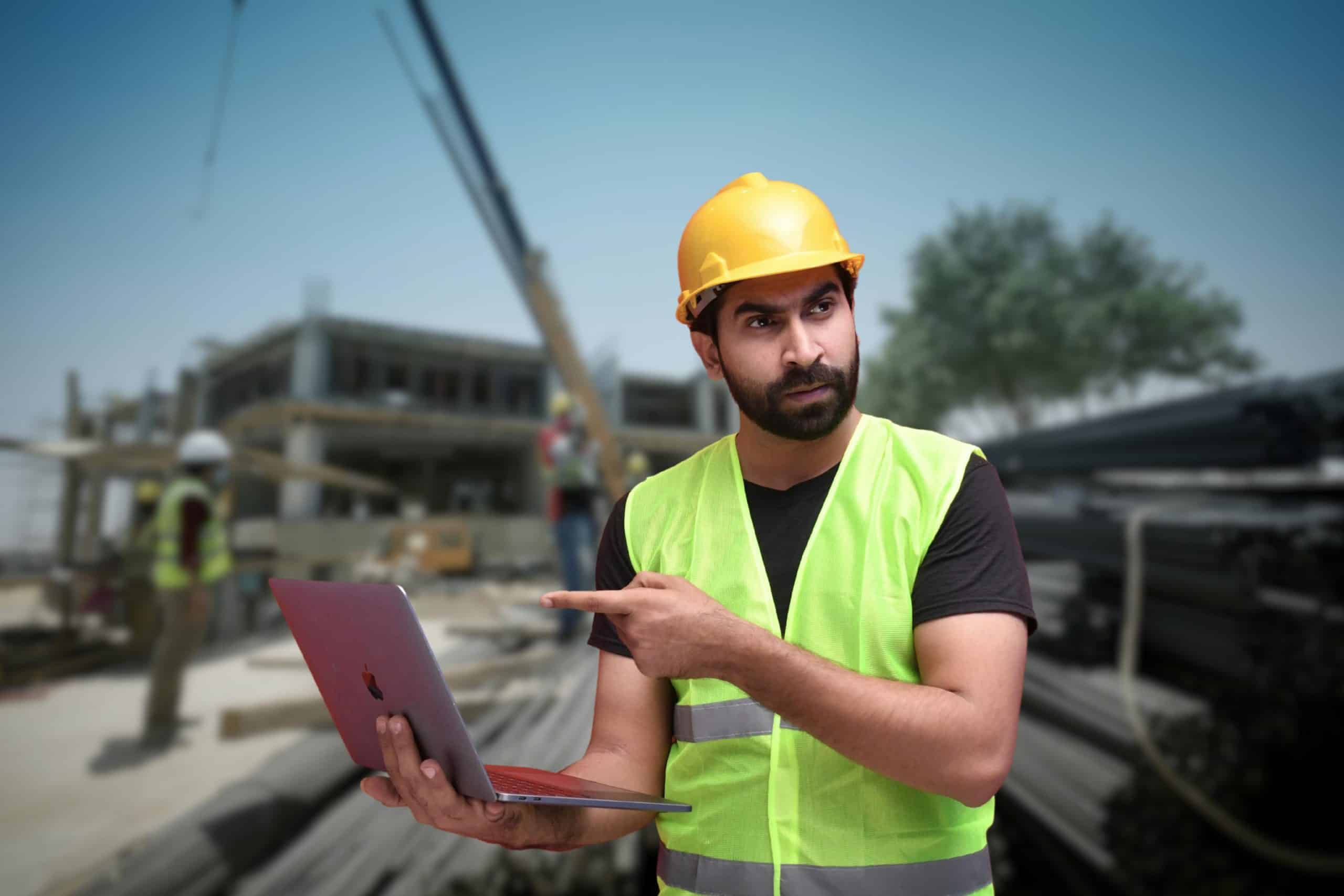 Bearded construction worker in a neon vest and yellow hard hat holds a laptop and points at it on a busy construction site.